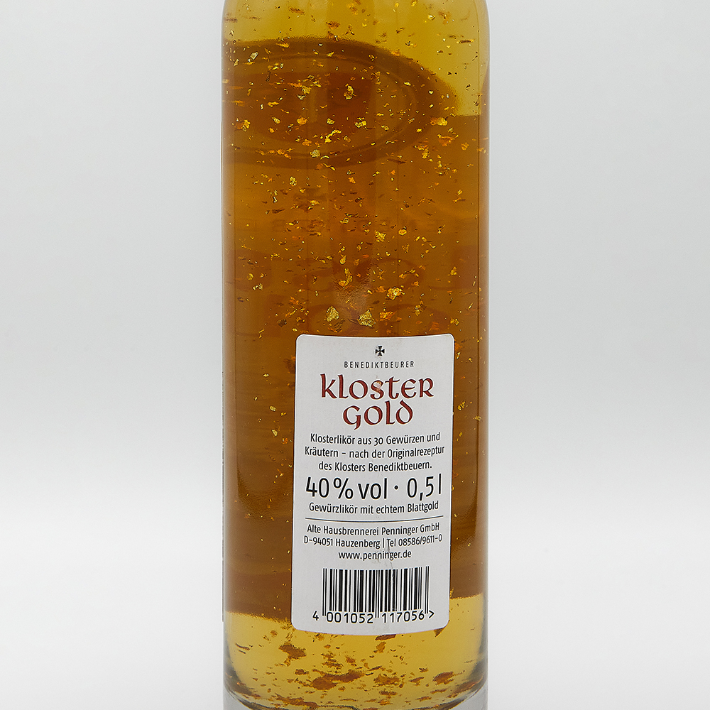 Unser feiner Likör Klostergold wird aus 30 edlen Gewürzen und ausgesuchten Kräutern nach altem Originalrezept hergestellt. Sein harmonisches Aroma ist bestimmt von Melisse, Pomeranzenschalen, Anis, Nelken und Angelikawurzeln. Benediktbeurer Klostergold ist ein Inbegriff für feinwürzigen, traditionellen deutschen Klosterlikör. Er schmeichelt dem Gaumen und belebt Geist und Sinne. Als Digestif, aber auch als Aperitif ist er ein besonderer Genuss. Das echte Blattgold und die hochwertige Abfüllung mit Korkverschluss machen ihn zudem zu einer Augenweide. Alkoholgehalt: 40 % vol